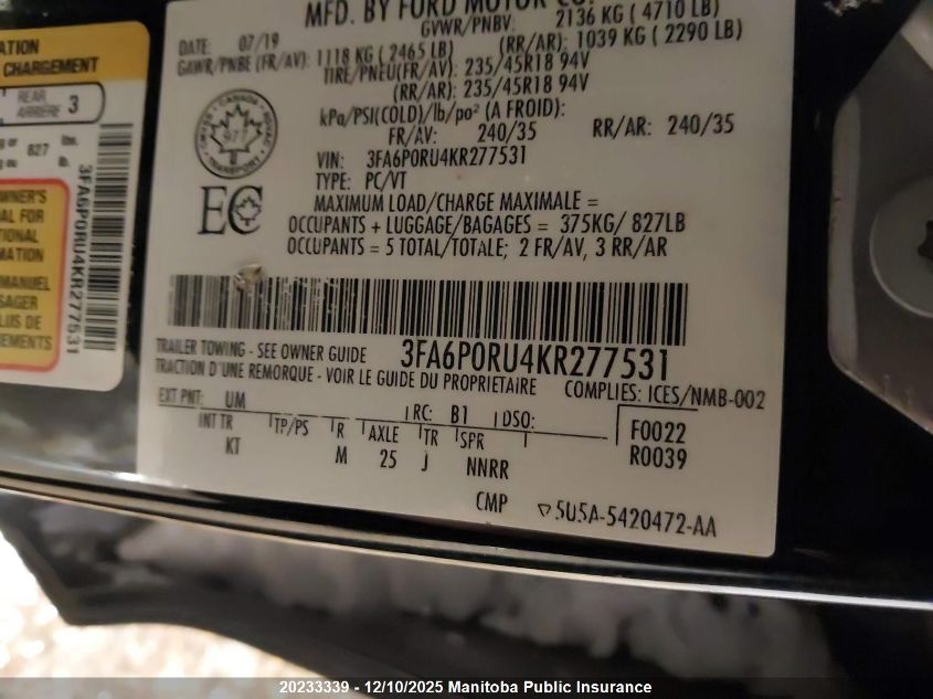 Цвет ЧерныйЦилиндры 4Привод Передний приводVIN 3FA6P0RU4KR277531Состояние СтационарноПовреждения ПередняяДата аукциона 2025-12-17