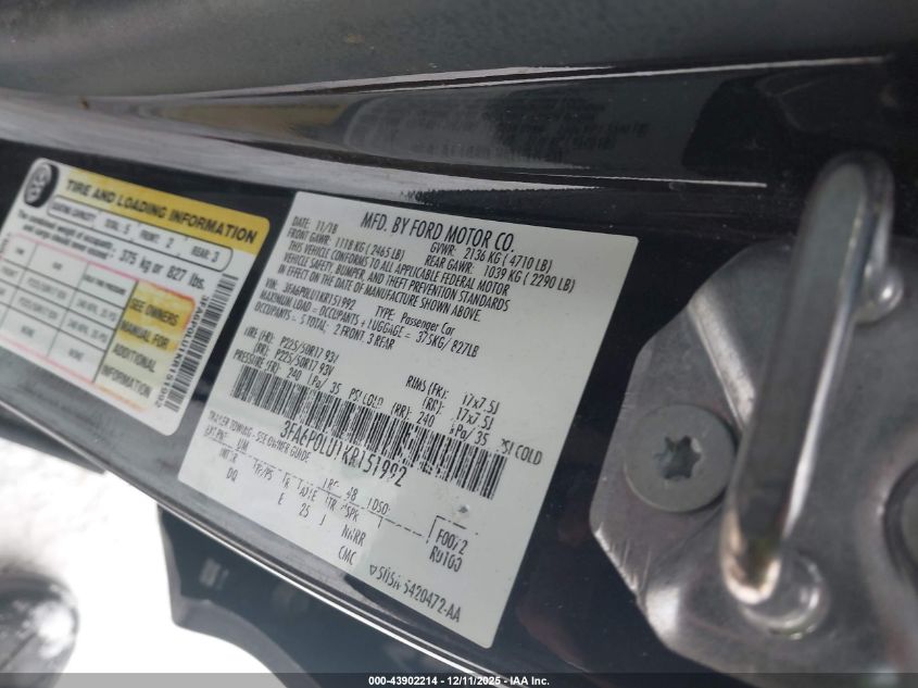 Цвет ЧерныйЦилиндры 4Привод Передний приводVIN 3FA6P0LU1KR151992Состояние СтационарноПовреждения Задняя левая