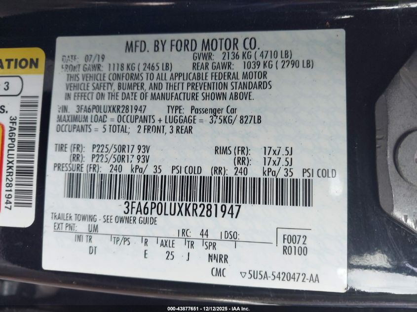 2019 FORD FUSION HYBRID - 3FA6P0LUXKR281947, цвет - Черный, 2.0, Гибрид, Передний привод из США
