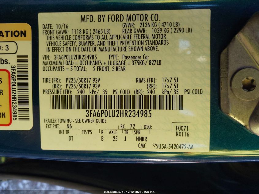 2017 FORD FUSION HYBRID - 3FA6P0LU2HR234985, цвет - Синий, 2.0, Гибрид, Передний привод из США
