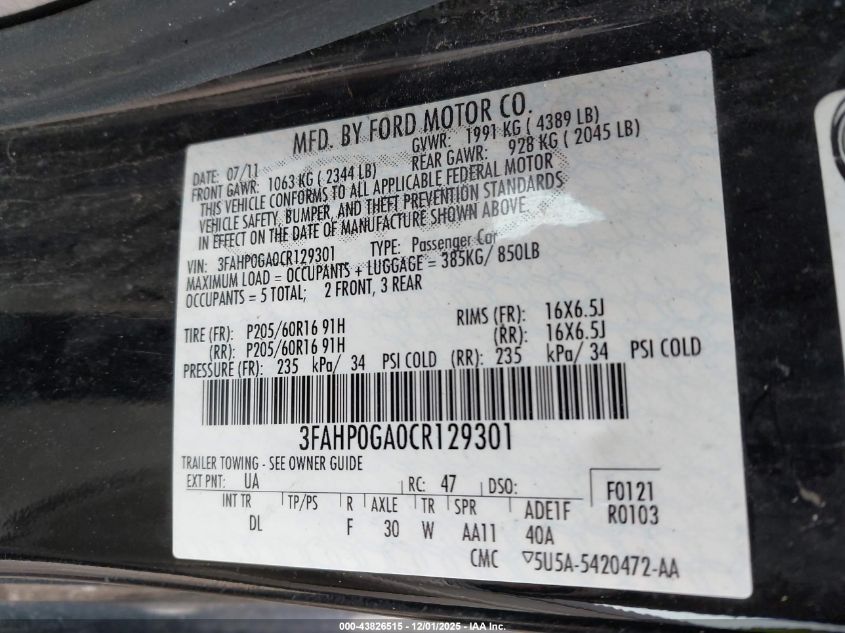 2012 FORD FUSION - 3FAHP0GA0CR129301, цвет - Черный, 2.5, Бензин, Передний привод из США