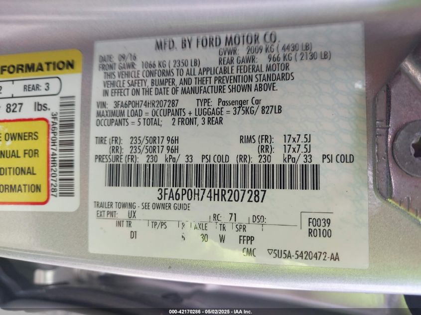 2017 FORD FUSION - 3FA6P0H74HR207287, цвет - Серебряный, 2.5, Бензин, Передний привод из США