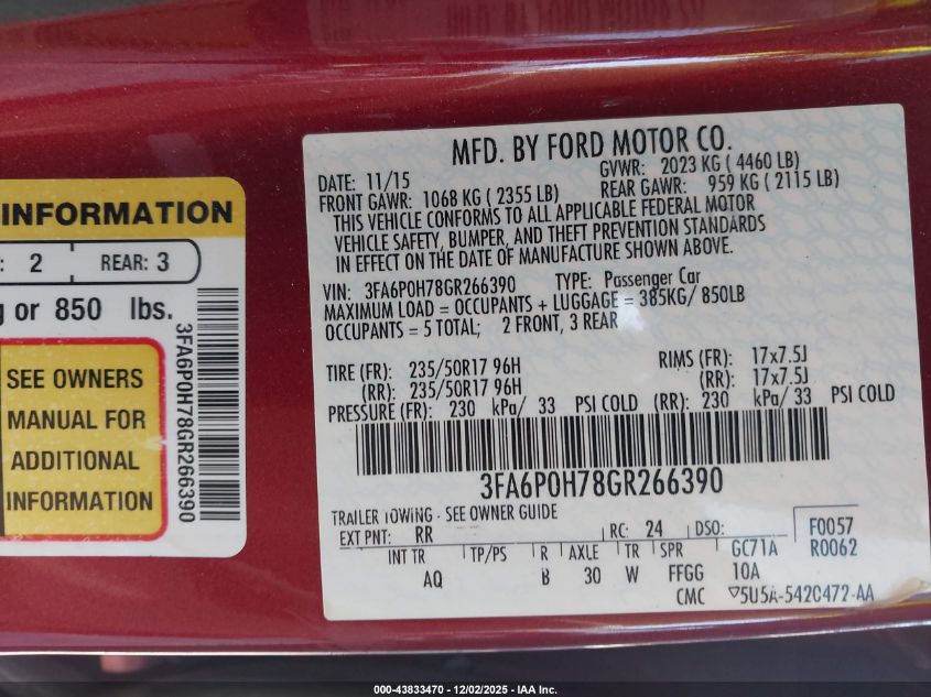 2016 FORD FUSION - 3FA6P0H78GR266390, цвет - Бордовый, 2.5, Бензин, Передний привод из США