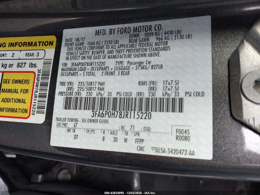 Цвет СерыйЦилиндры 4Привод Передний приводVIN 3FA6P0H78JR115220Состояние Заводится и едет (проверено)Повреждения ЗадняяДата аукциона 2025-12-18