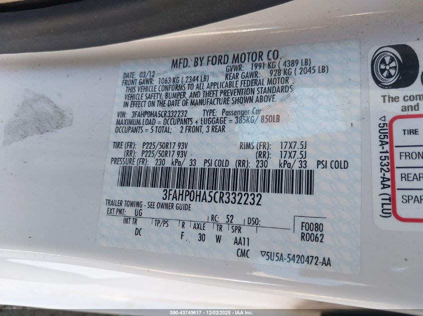 2012 FORD FUSION - 3FAHP0HA5CR332232, цвет - Белый, 2.5, Бензин, Передний привод из США