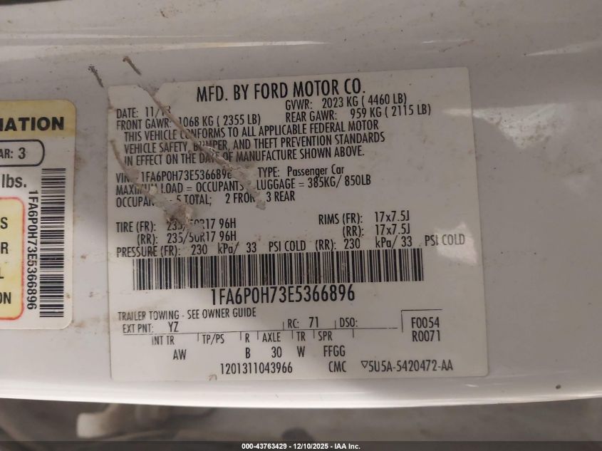 Цвет БелыйЦилиндры 4Привод Передний приводVIN 1FA6P0H73E5366896Состояние СтационарноПовреждения Передняя или задняя