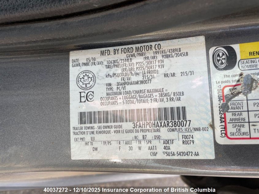 2010 FORD FUSION - 3FAHP0HAXAR380077, цвет - Серый, , Бензин, Передний привод из США
