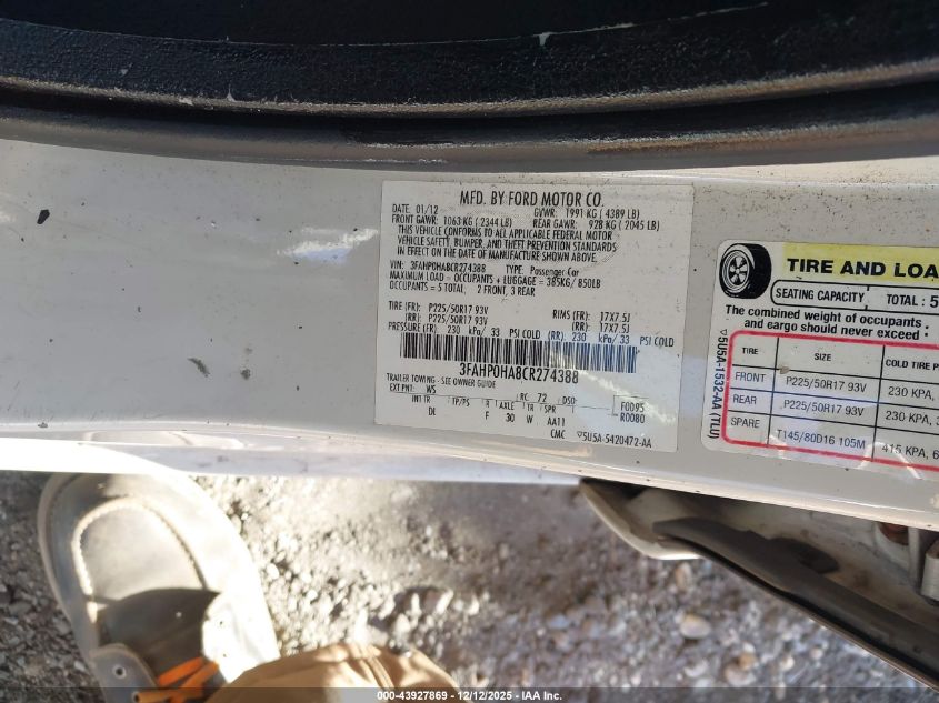 2012 FORD FUSION - 3FAHP0HA8CR274388, цвет - Белый, 2.5, Бензин, Передний привод из США