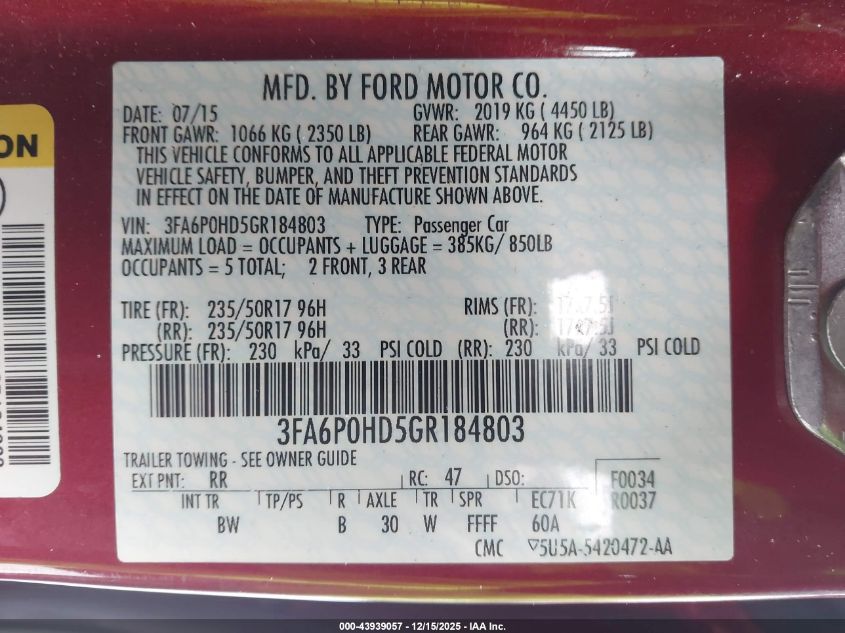 2016 FORD FUSION - 3FA6P0HD5GR184803, цвет - Бордовый, 1.5, Бензин, Передний привод из США