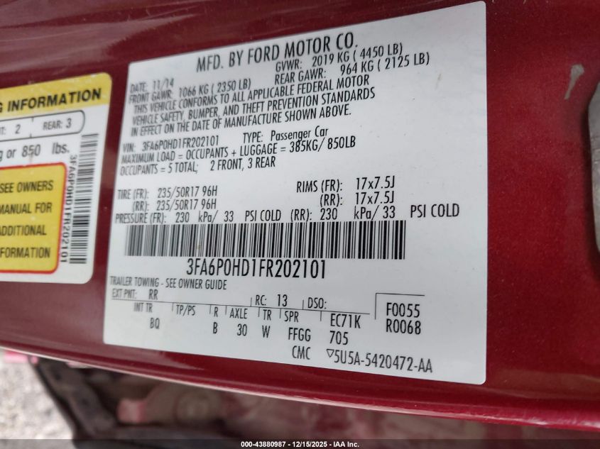 2015 FORD FUSION - 3FA6P0HD1FR202101, цвет - Бордовый, 1.5, Бензин, Передний привод из США