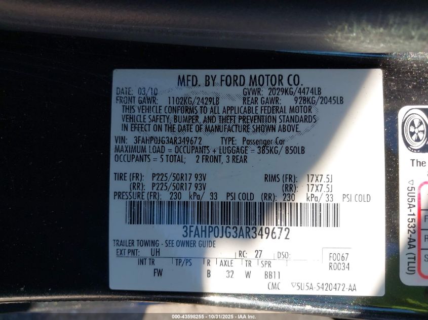 Цвет ЧерныйЦилиндры 6Привод Передний приводVIN 3FAHP0JG3AR349672Состояние Заводится и едет (проверено)Повреждения Правая сторонаДата аукциона 2025-12-18