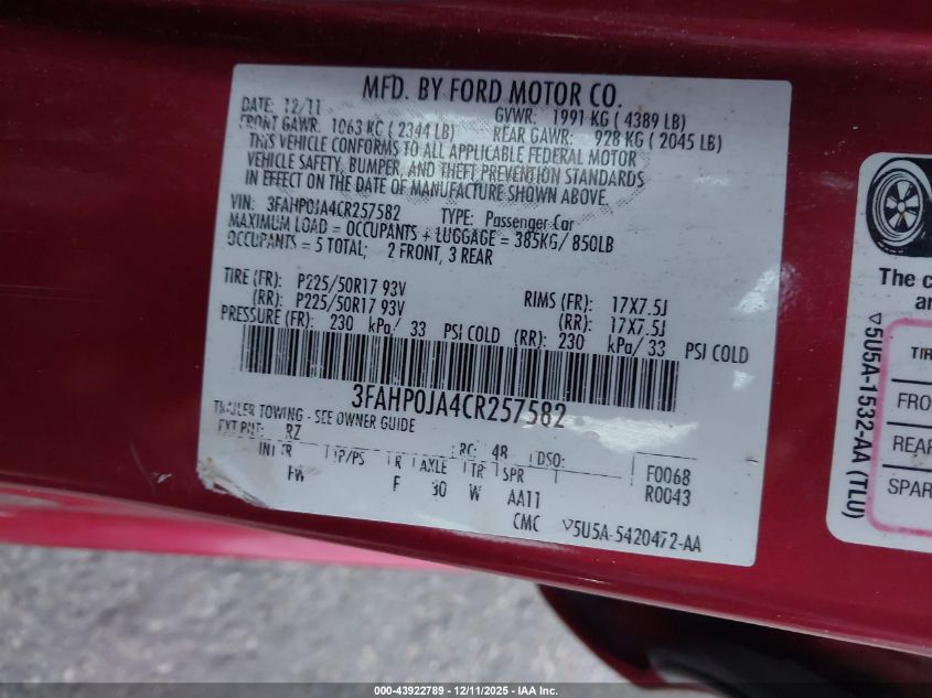 2012 FORD FUSION - 3FAHP0JA4CR257582, цвет - Красный, 2.5, Бензин, Передний привод из США