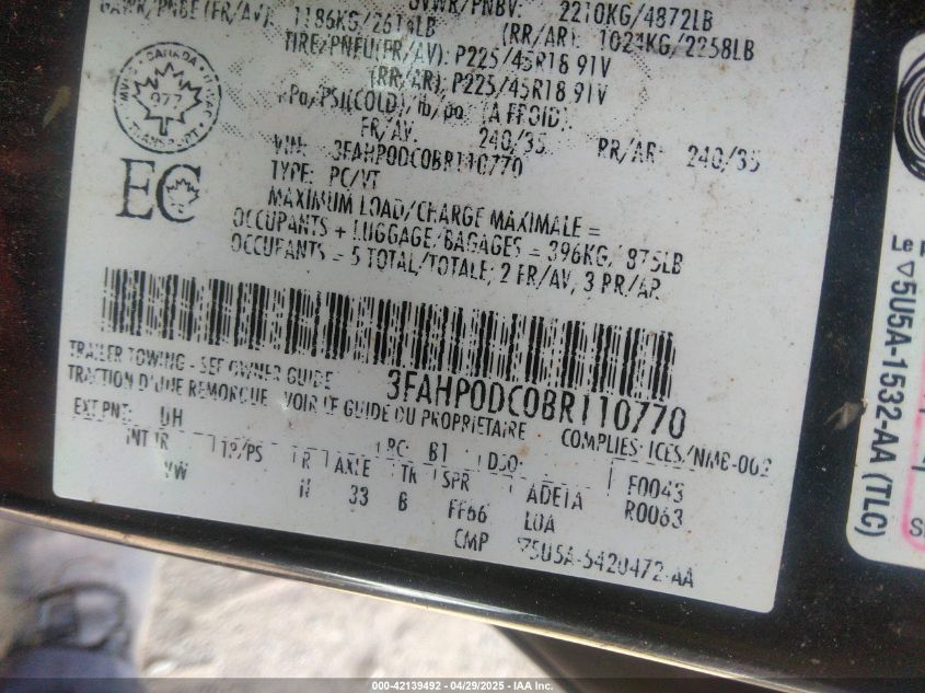 Цвет ЧерныйЦилиндры 6Привод Полный приводVIN 3FAHP0DC0BR110770Состояние СтационарноПовреждения Передняя или задняя