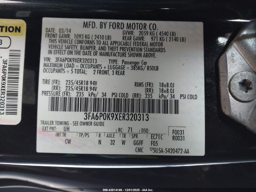 2014 FORD FUSION - 3FA6P0K9XER320313, цвет - Черный, 2.0, Бензин, Передний привод из США