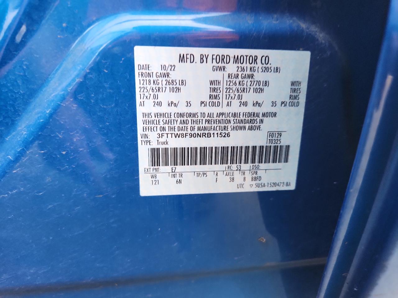 Цвет СинийЦилиндры 4Привод Полный приводVIN 3FTTW8F90NRB11526Состояние Заводится и едет (проверено)Повреждения Передняя или задняя