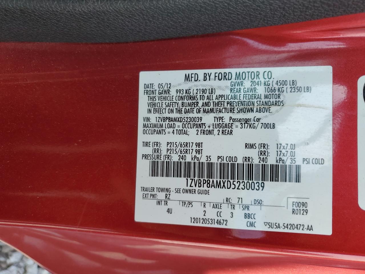 Цвет КрасныйЦилиндры 6Привод Задний приводVIN 1ZVBP8AMXD5230039Состояние Заводится и едет (проверено)Повреждения Передняя или задняяДата аукциона 2025-10-08