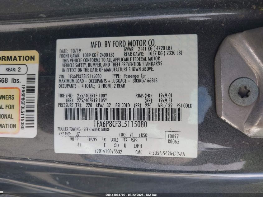 Цвет СерыйЦилиндры 8Привод Задний приводVIN 1FA6P8CF3L5115080Состояние СтационарноПовреждения По всему авто