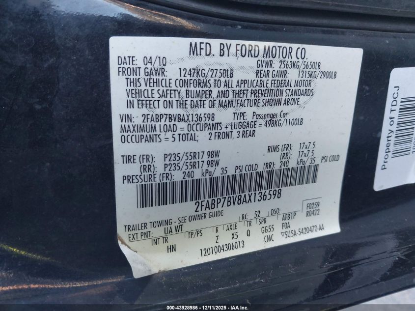 2010 FORD POLICE INTERCEPTOR - 2FABP7BV8AX136598, цвет - Черный, 4.6, Бензин, Задний привод из США