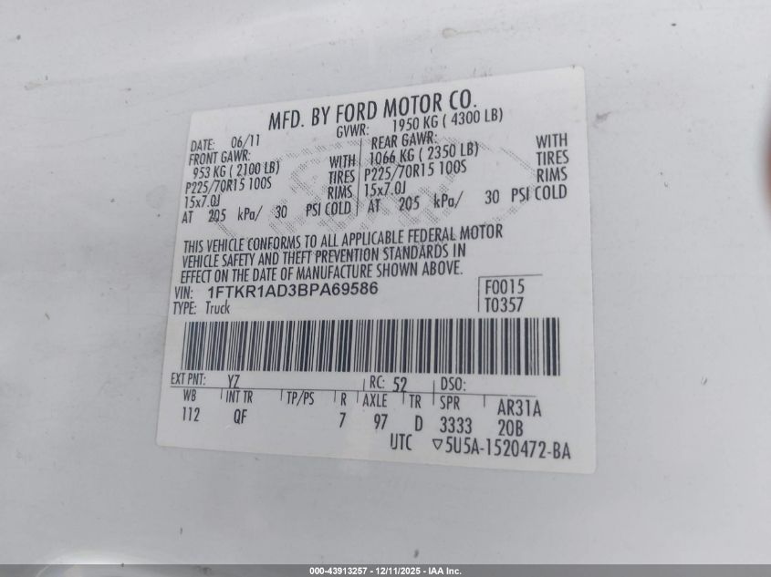 2011 FORD RANGER - 1FTKR1AD3BPA69586, цвет - Белый, 2.3, Бензин, из США