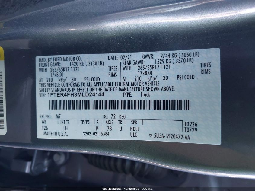 2021 FORD RANGER - 1FTER4FH3MLD24144, цвет - Серый, 2.3, Бензин, Полный привод из США