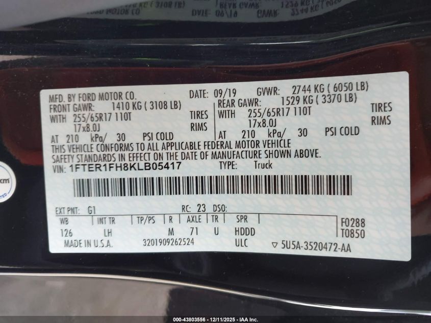 2019 FORD RANGER - 1FTER1FH8KLB05417, цвет - Черный, 2.3, Бензин, Полный привод из США