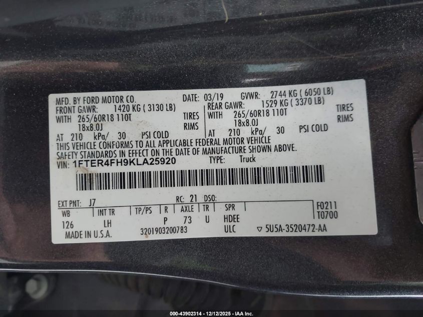 2019 FORD RANGER - 1FTER4FH9KLA25920, цвет - Серый, 2.3, Бензин, Полный привод из США