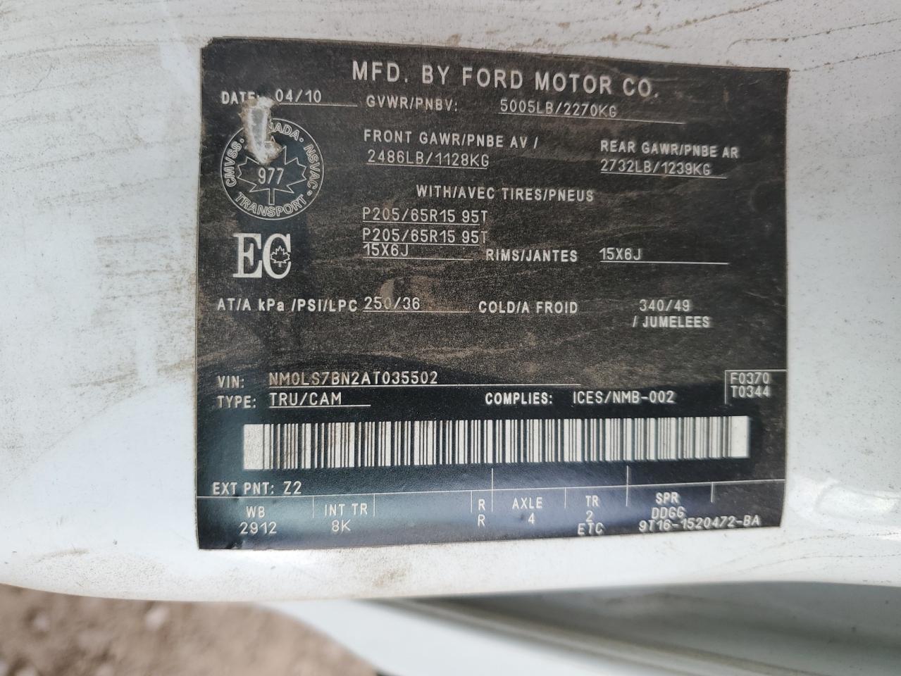 2010 FORD TRANSIT CONNECT - NM0LS7BN2AT035502, цвет - Белый, 2.0, Бензин, из США