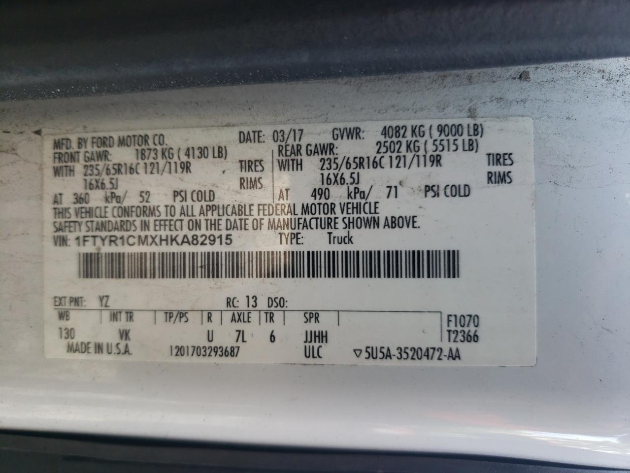 2017 FORD TRANSIT - 1FTYR1CMXHKA82915, цвет - Белый, 3.7, Бензин, Задний привод из США