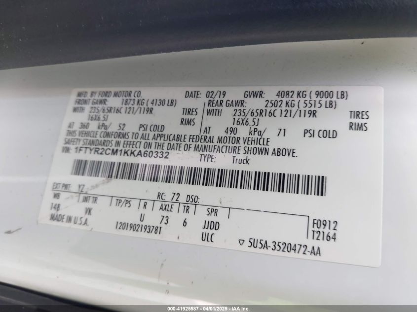 2019 FORD TRANSIT - 1FTYR2CM1KKA60332, цвет - Белый, 3.7, Бензин, Задний привод из США