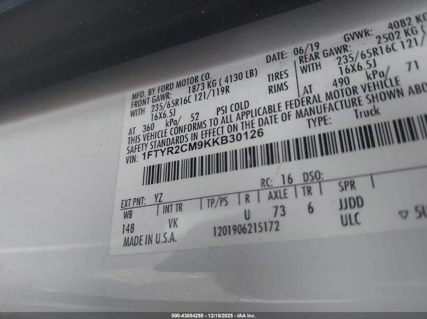 2019 FORD TRANSIT - 1FTYR2CM9KKB30126, цвет - Белый, 3.7, Бензин, Задний привод из США