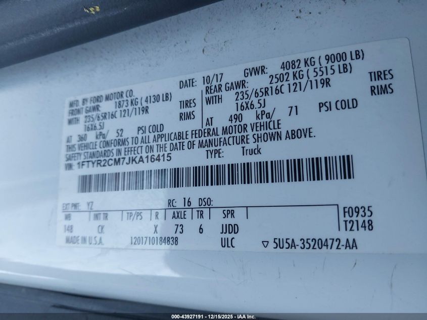 2018 FORD TRANSIT - 1FTYR2CM7JKA16415, цвет - Белый, 3.7, Бензин, Задний привод из США