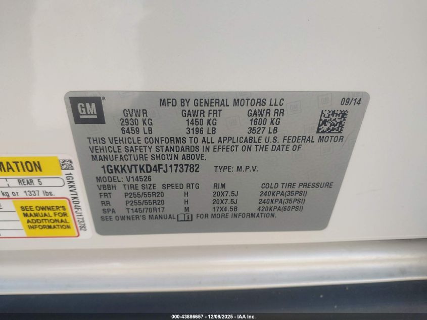 Цвет БелыйЦилиндры 6Привод Полный приводVIN 1GKKVTKD4FJ173782Состояние СтационарноПовреждения Задняя левая