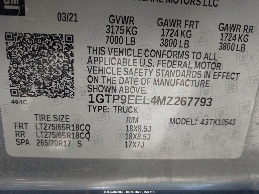 Цвет СерыйЦилиндры 8Привод Полный приводVIN 1GTP9EEL4MZ267793Состояние СтационарноПовреждения ЗадняяДата аукциона 2025-12-17