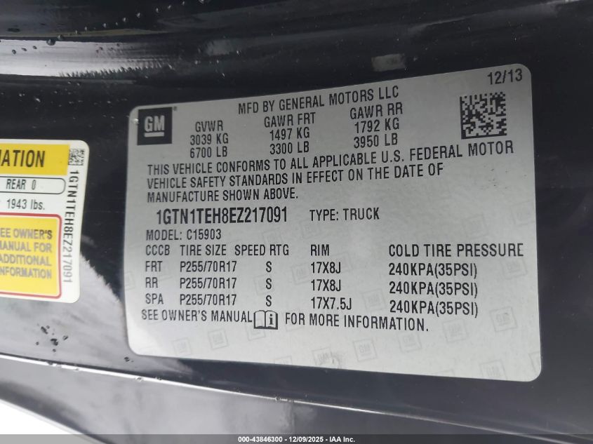 2014 GMC SIERRA 1500 - 1GTN1TEH8EZ217091, цвет - Черный, 4.3, Бензин, из США