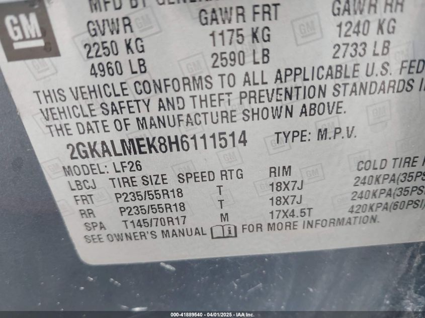 Цвет СинийЦилиндры 4Привод Передний приводVIN 2GKALMEK8H6******Состояние НеизвестноПовреждения Правая сторона