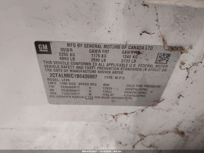 2011 GMC TERRAIN - 2CTALMEC1B6435887, цвет - Белый, 2.4, Бензин, Передний привод из США