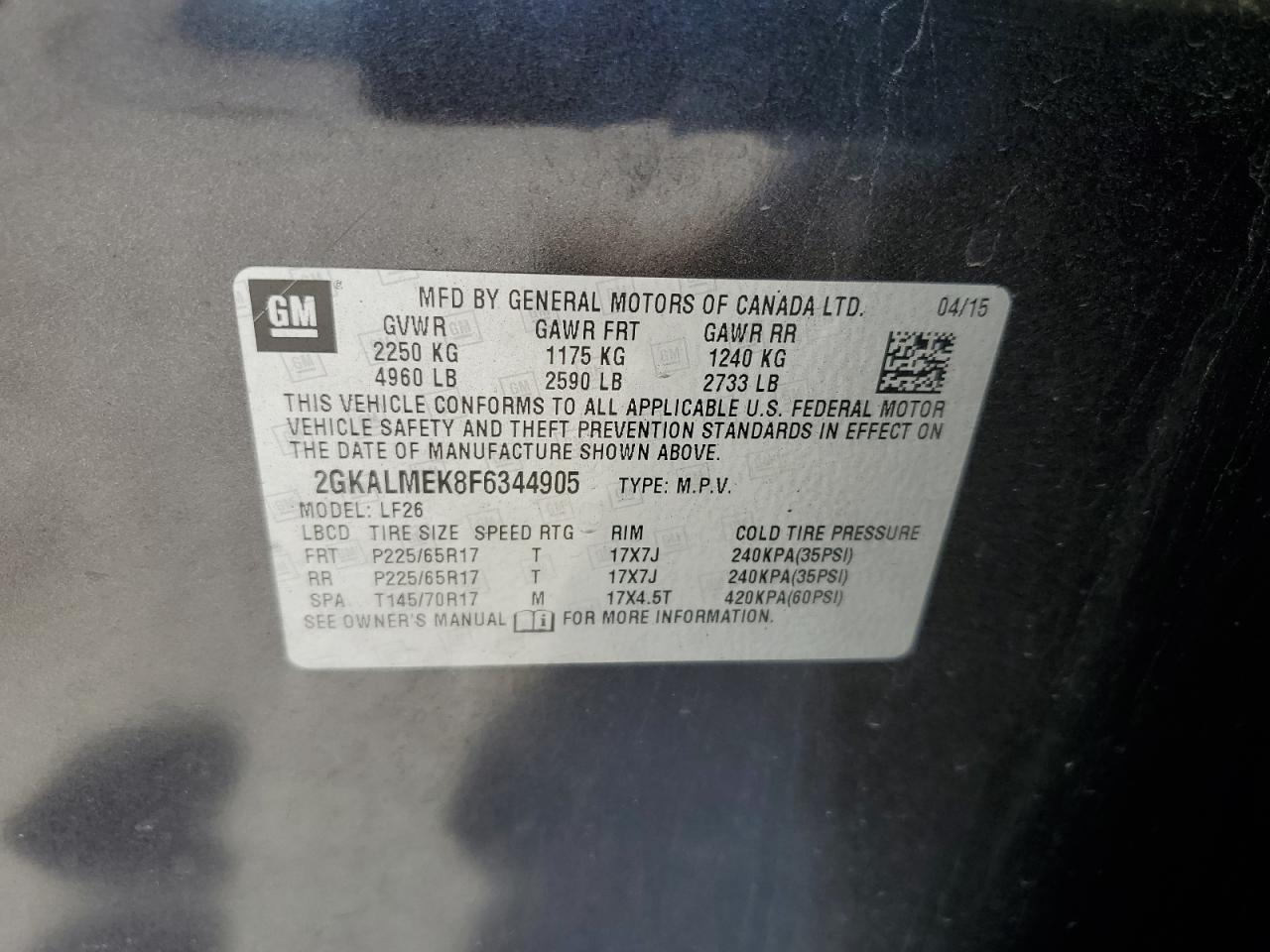 2015 GMC TERRAIN - 2GKALMEK8F6344905, цвет - Серый, 2.4, Бензин, из США