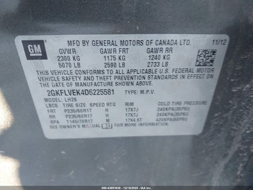Цвет СерыйЦилиндры 4Привод Полный приводVIN 2GKFLVEK4D6225581Состояние Заводится и едет (проверено)Повреждения Обычный износ