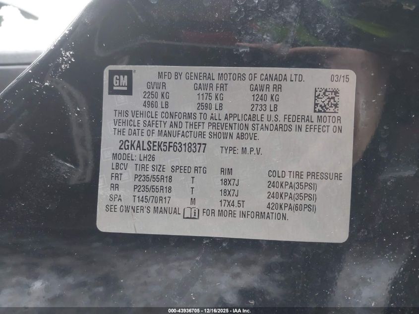 2015 GMC TERRAIN - 2GKALSEK5F6318377, цвет - , 2.4, Бензин, Передний привод из США