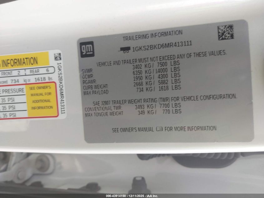 2021 GMC YUKON - 1GKS2BKD6MR413111, цвет - Белый, 5.3, Бензин, Полный привод из США