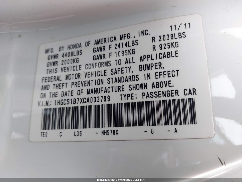Цвет БелыйЦилиндры 4Привод Передний приводVIN 1HGCS1B7XCA003799Состояние ЗаводитсяПовреждения Правая сторона
