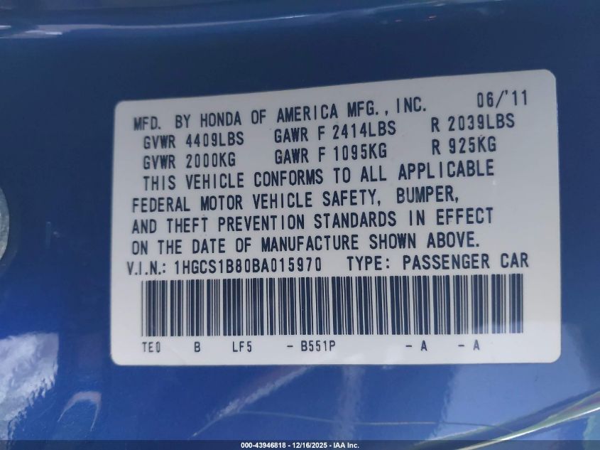 2011 HONDA ACCORD - 1HGCS1B80BA015970, цвет - Синий, 2.4, Бензин, Передний привод из США