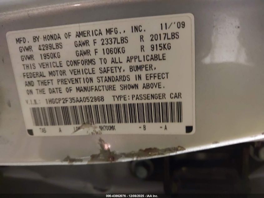 2010 HONDA ACCORD - 1HGCP2F35AA052968, цвет - Серебряный, 2.4, Бензин, Передний привод из США