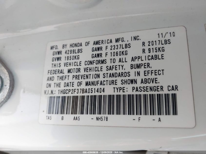 Цвет БелыйЦилиндры 4Привод Передний приводVIN 1HGCP2F37BA051404Состояние Заводится и едет (проверено)Повреждения Правая сторонаДата аукциона 2025-12-24