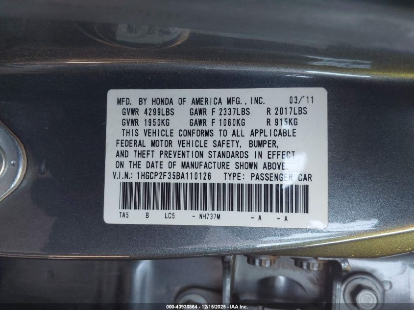2011 HONDA ACCORD - 1HGCP2F35BA110126, цвет - Серый, 2.4, Бензин, Передний привод из США