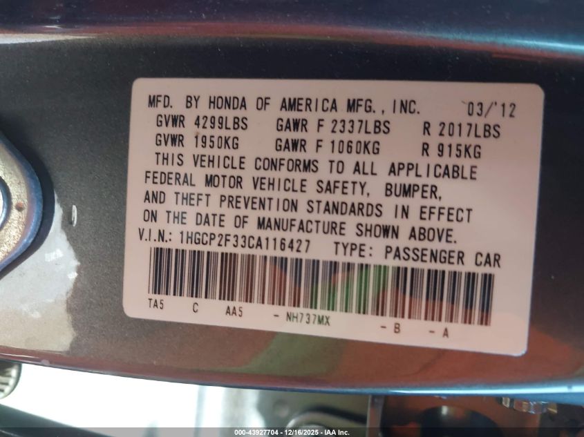 2012 HONDA ACCORD - 1HGCP2F33CA116427, цвет - , 2.4, Бензин, Передний привод из США