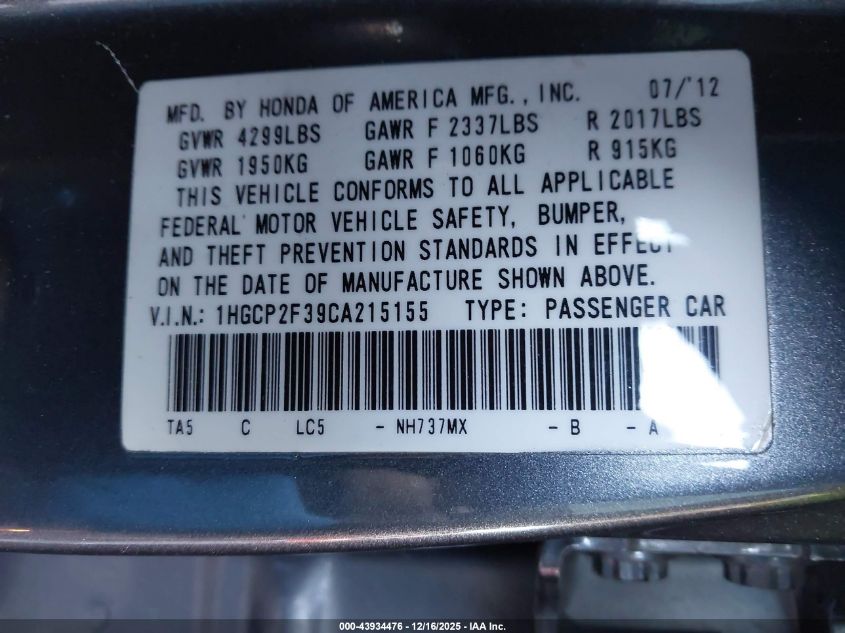 2012 HONDA ACCORD - 1HGCP2F39CA215155, цвет - , 2.4, Бензин, Передний привод из США