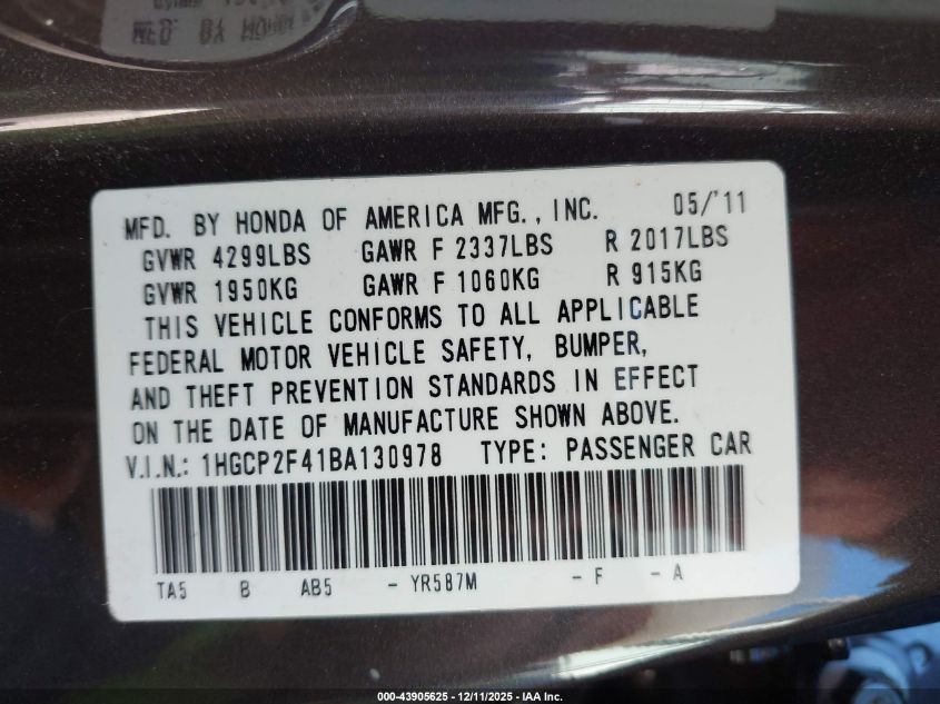 2011 HONDA ACCORD - 1HGCP2F41BA130978, цвет - Черный, 2.4, Бензин, Передний привод из США