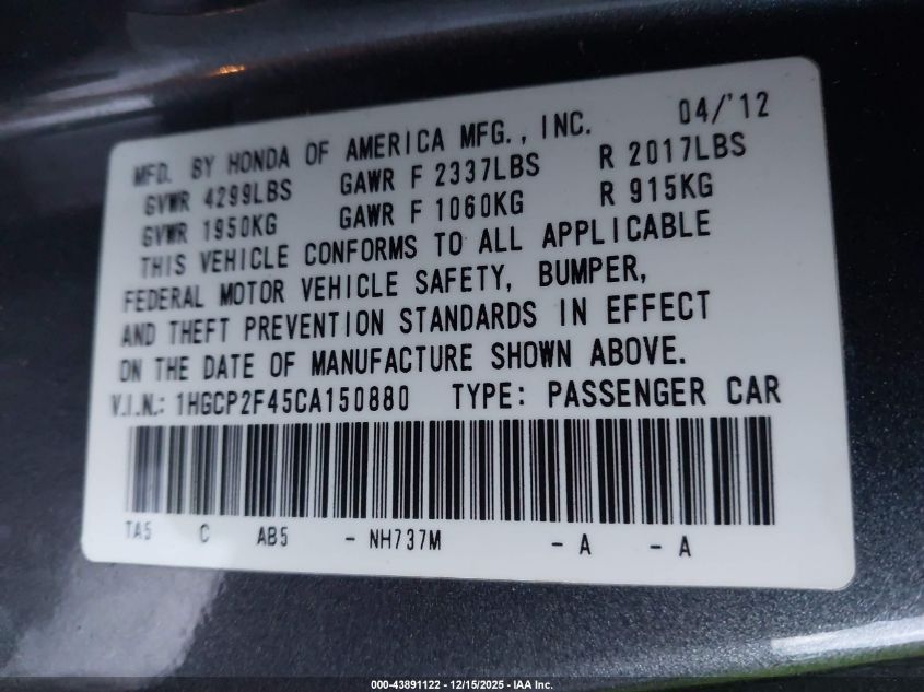 2012 HONDA ACCORD - 1HGCP2F45CA150880, цвет - Серый, 2.4, Бензин, Передний привод из США