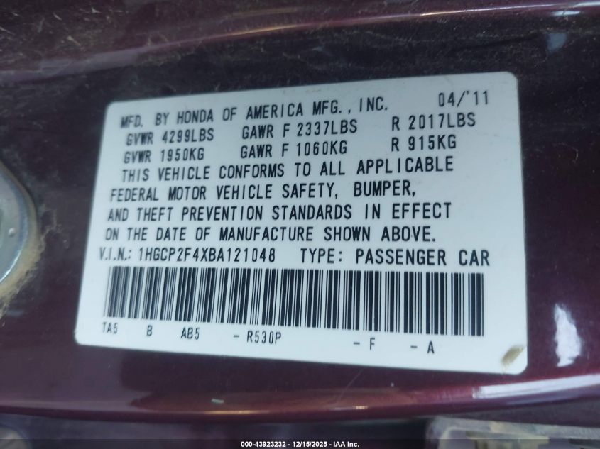 2011 HONDA ACCORD - 1HGCP2F4XBA121048, цвет - Бургундия, 2.4, Бензин, Передний привод из США
